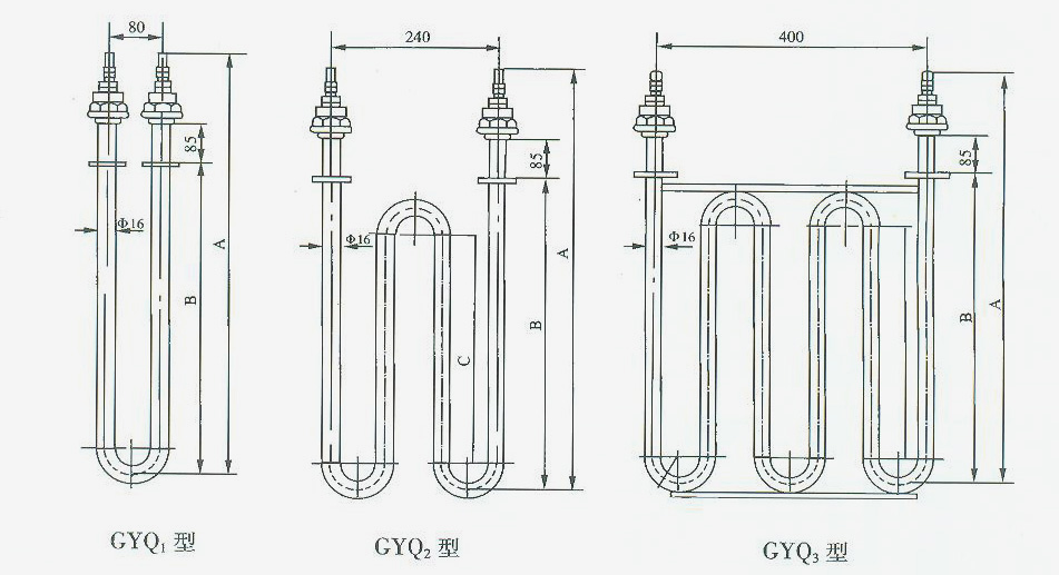 GYQ型电热元件用于安装在空气加热系统的吹风管道中。作吹送热空气用,也可作为各种烘箱、电炉的发热元件。管子材料为10号钢,其最高工作温度300℃。